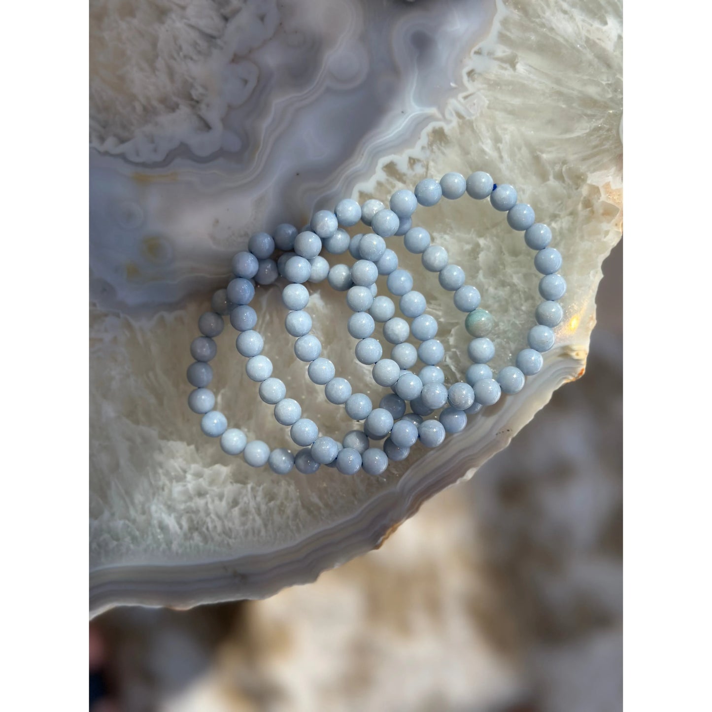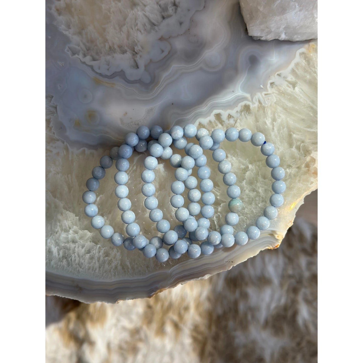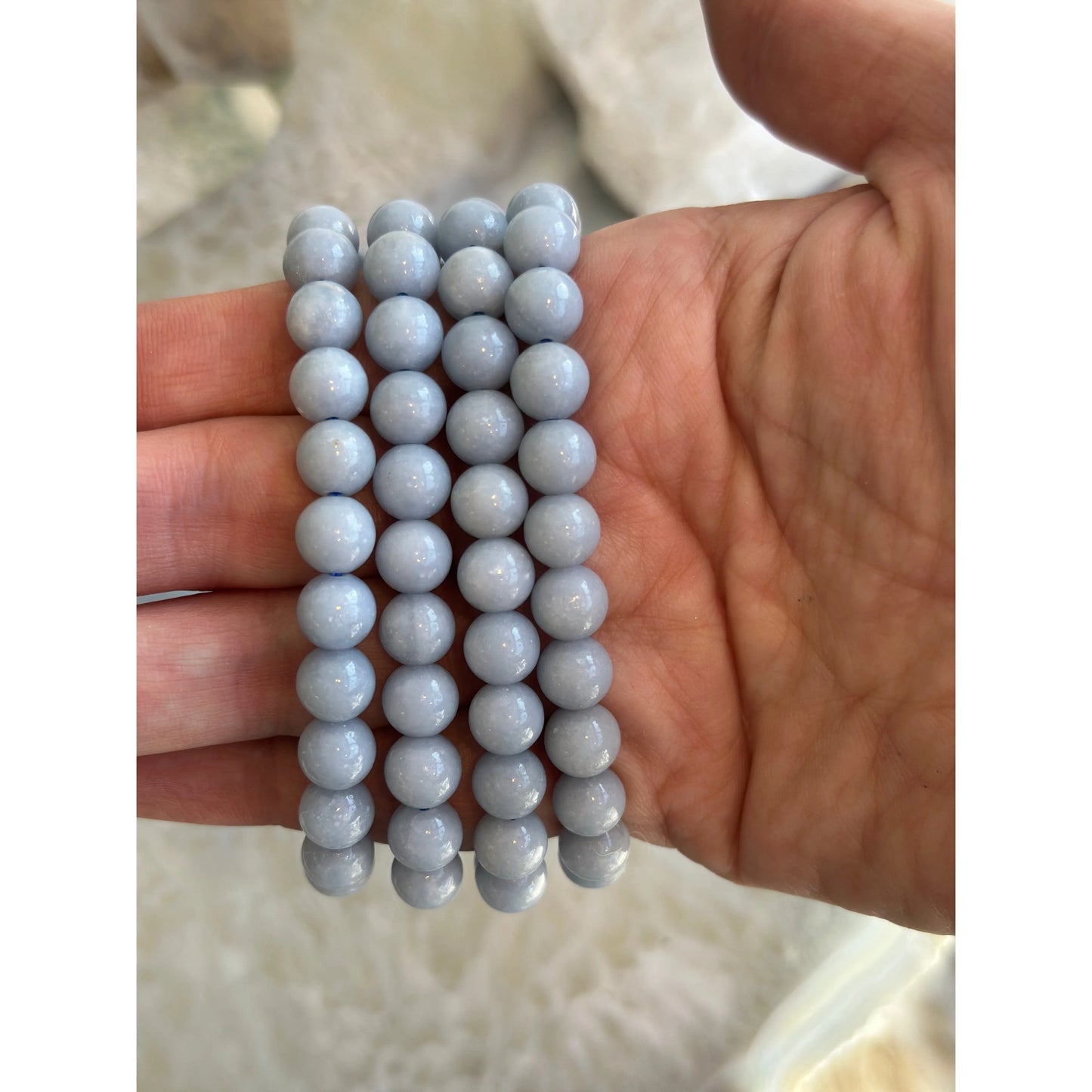 Crafted with genuine 8mm Angelite beads on a durable stretch cord, this bracelet is ideal for meditation, spiritual practice, or daily wear. Angelite is often associated with the throat chakra, helping to open pathways for honest, compassionate expression.