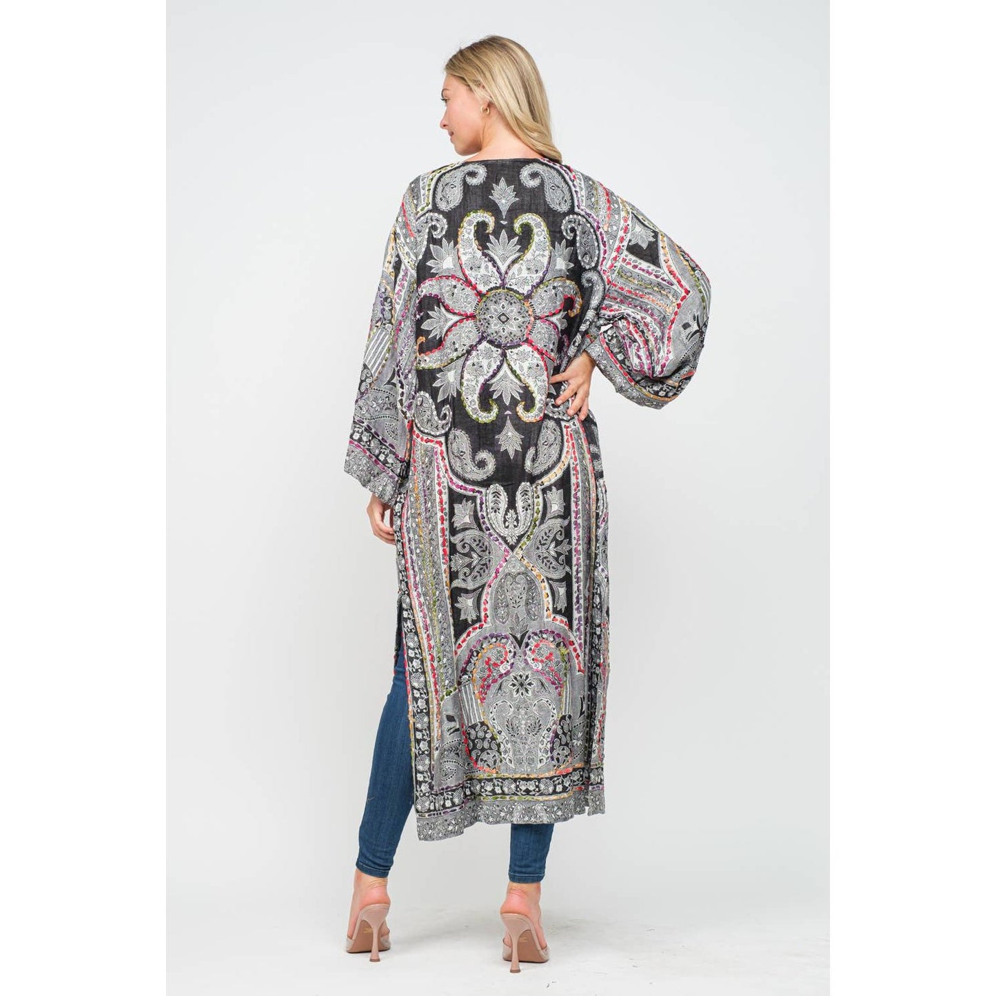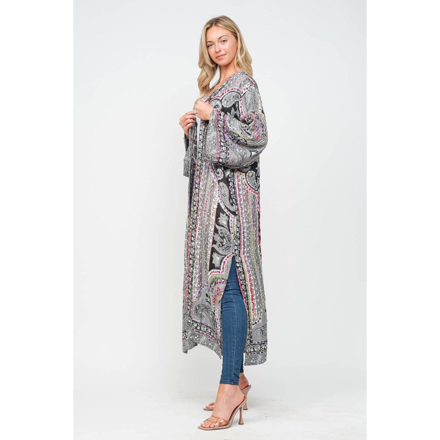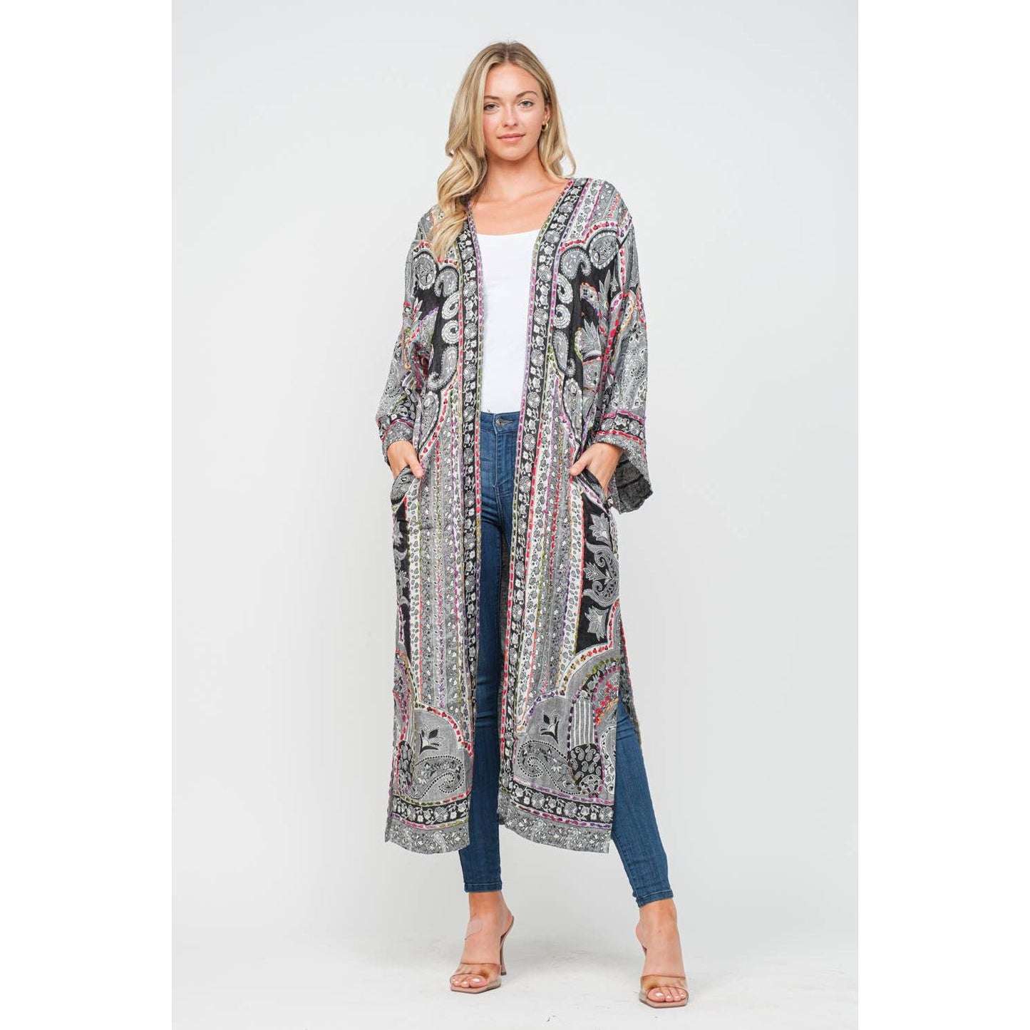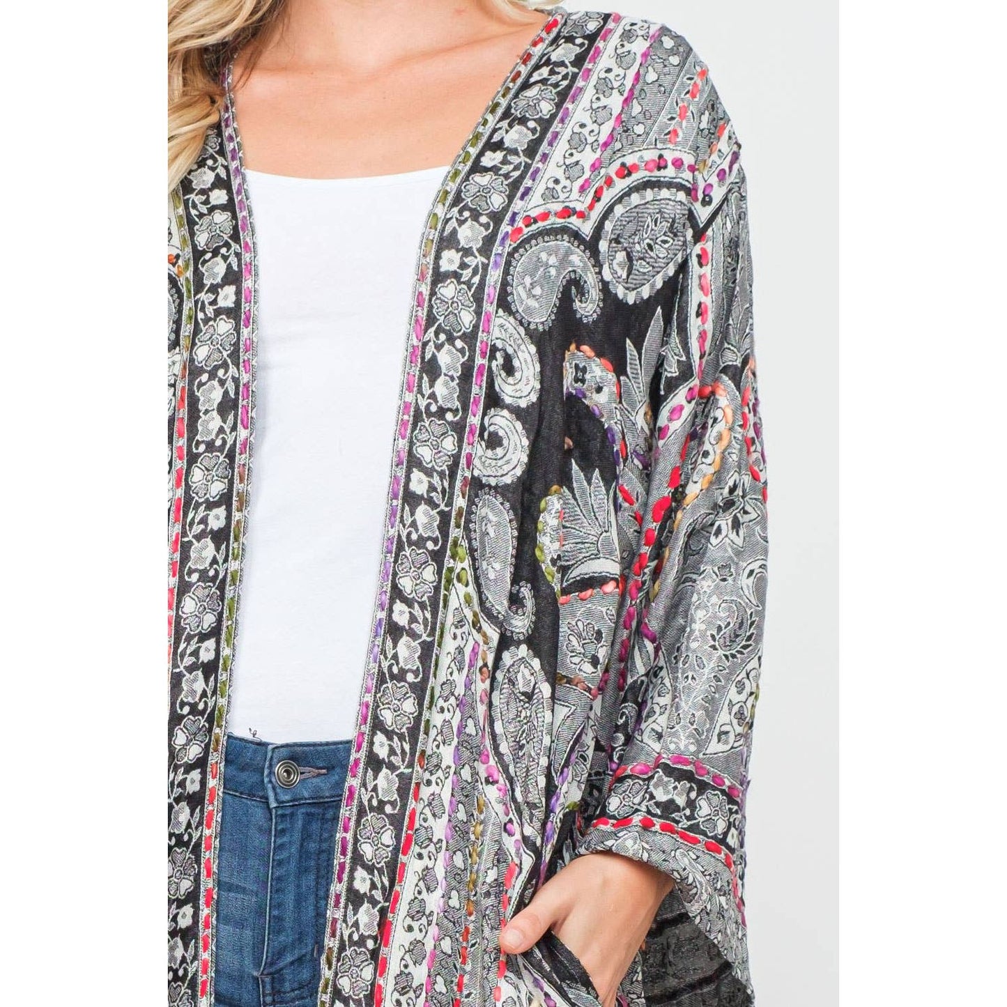This yarn stitch embroidered duster effortlessly creates a unique statement to versatile styles.