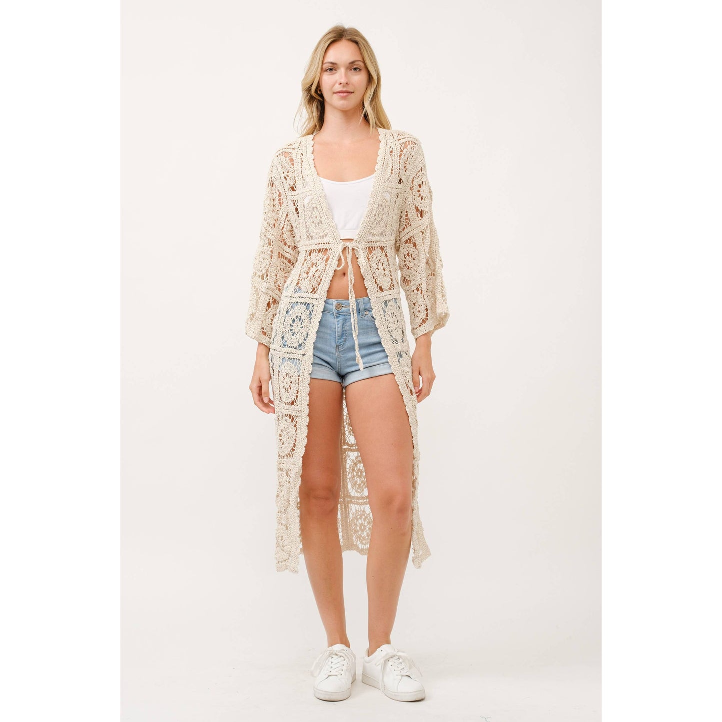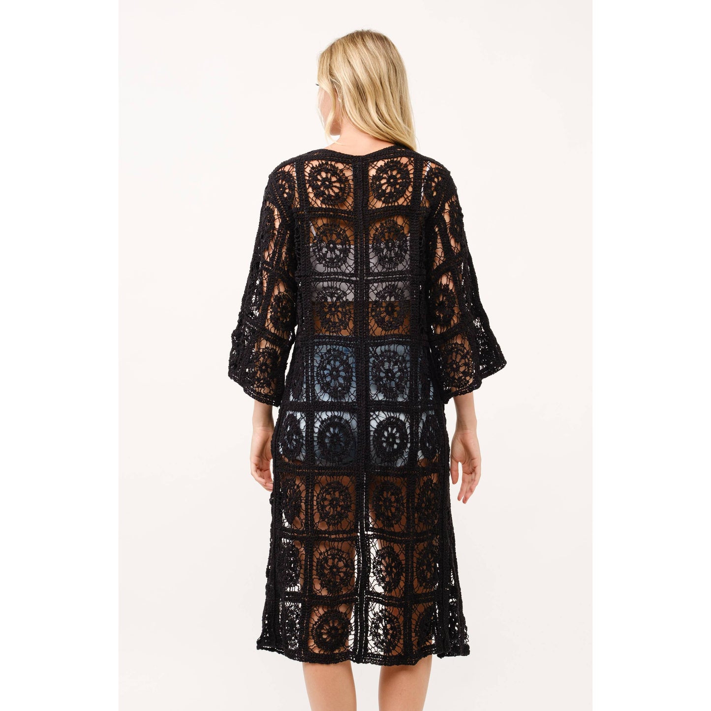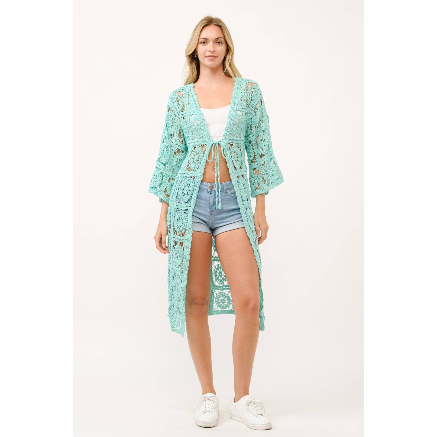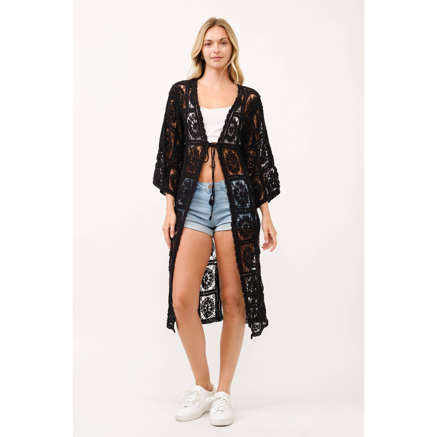 Step into effortless boho chic with our crochet kimono, gracefully draping and flattering silhouette. This kimono exudes artisanal charm and adds a touch of laid-back elegance to any outfit. Whether layered over a swimsuit for a beach-ready look or paired with jeans and a tank top for casual outings, this versatile piece is sure to become a wardrobe favorite.