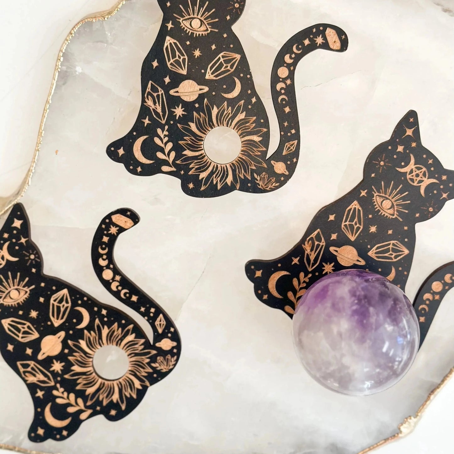 Wood Sphere Stand – Galaxy Cat Edition | Crystal Ball & Gemstone Display Holder
